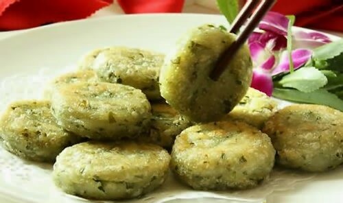 3.趁热取煮养心菜的水100克和糯米粉、粘米粉拌好和匀,再加适量的冷水揉成“三生面“米粉面团,搓条下剂成30克一个的剂子,逐个压扁包入苏麻馅心,封口向下,压成直径7厘米、厚度1。5厘米的圆饼生坯。然后将平锅烧热刷油,放入饼坯用中火慢慢烙至两面微黄,熟后铲出装盘即成。
