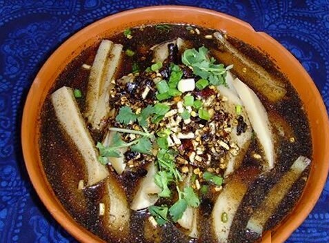 2.鸡汤烧沸,冲入米豆腐碗中,表面撒上榨菜丁、折二根丁、姜末、葱花、蒜末、香菜、精盐、味精、酱油、煳辣椒面即成。