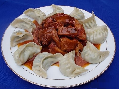 5、炒锅置火上,放入五香卤汁烧沸,勾入薄欠,待汁收稠起小泡时,淋入香油起锅,浇裹在扣好的鸭上,放蒸制好的饺子围在盘边上桌即成。