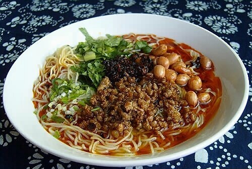 2,锅加清水烧沸,下鸡蛋细面条下锅煮熟后装碗加肉末臊子、油炸花生,撒葱花、香菜,淋红油即成。