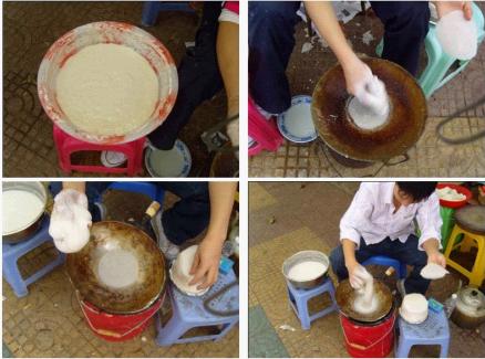 制作过程:将面粉加冷水、盐揉搓均匀待用;平底锅烧热,锅底刷一层菜油,右手抓起面团甩圆在锅内粘一下,成直径9厘米薄片,左手立即揭起面皮,如此反复制作面皮若干张,放入蒸笼稍蒸回软,绿豆芽、海带丝、芹菜节、蕨菜节等用开水汆过,分别装入小盘待用,小碗内放入酱油、醋、味精、香油、姜末、葱花、煳辣椒面调制味汁;面皮上放各类原料丝和凉面,卷起面皮包成上大下小的兜形,放炸黄豆,淋味汁食用。