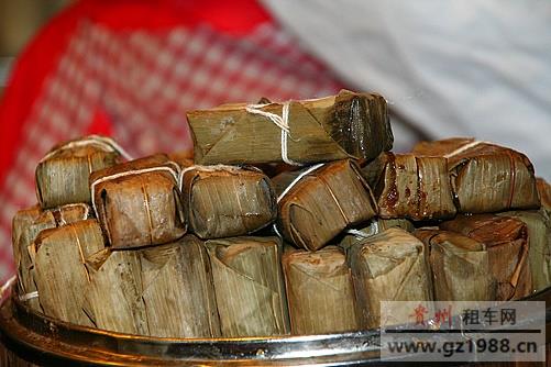4.将斑竹叶用温水泡软洗净,以之包粑块,用绳子扎紧,上笼中大火蒸8-10小时,再微火保温8-12小时,取出晾冷即可冷食,也可蒸食、炸食、煎食、烤食或烙食。