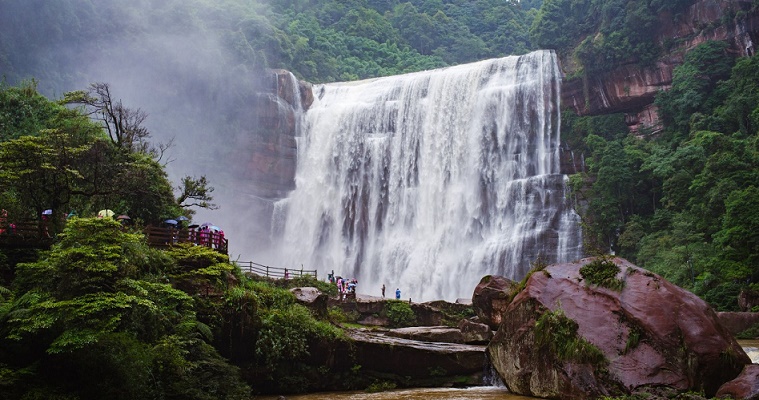 赤水大瀑布悬挂在红色丹霞悬崖上,高76米,宽80米,比黄果树瀑布高8米、窄1米,是我国丹霞地貌上最大的瀑布,也是我国长江流域上最大的瀑布。