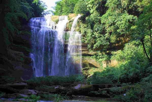 沿途林木茂密,到处飞帘溅珠,四级瀑布瀑宽均在四十米左右,落差高者近五十米,神韵俱佳,有如翠螺沐浴,或似新月流光,或若玉蟾戏蛇,或像云中落锦。