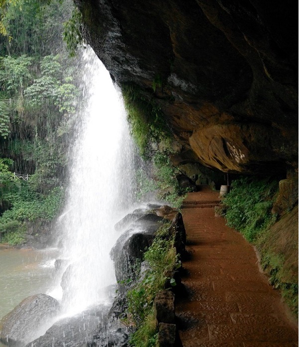 莲台瀑布——瀑布高42米,宽14米。该瀑布形如一尊大佛抱拥一尊小佛、小佛胸怀一侧面人头像端坐在莲花台上,瀑布从大、小坐佛的头部和双肩飞流而下,分两幅玉帘泻入莲台碧潭,水雾弥人。晴天丽日,瀑下彩虹环绕,仿佛一人一环,十分迷人。当地人说,遇到这一现象的人都要交好运,因为那一 道道光环是佛光环,是佛恩赐的幸运物。在瀑布的下方还有一块80余平方米的天然观瀑台,站在观瀑台上向远方眺望,可见连绵不断的群山向你款款而至,使你有一种拥抱大自然的激情。当你对群山放声高呼,群山就会给你回应,清新的空气扑面涌来。