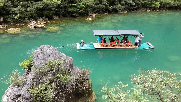 舟行约2公里,有高60米、孔宽20米的天生桥矗立于花草树木丛中,一道奔腾不息的瀑布映衬上面的"桥"身,静中生动,静内出声。过天生桥,地下湖又是一番神秘,使游人惊喜不已。