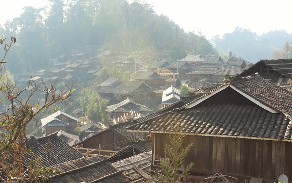 岜沙苗寨在山上,自然景观漂亮。大山云雾缭绕。