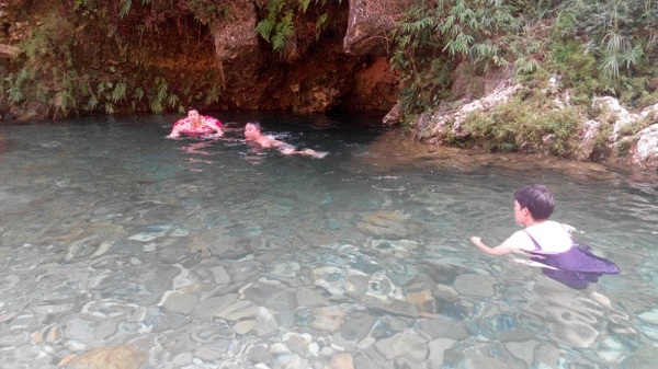 冷水河源头,飞瀑而下,流水清澈透底。