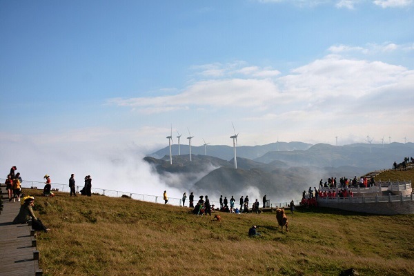 当你登顶之后,你就站在了贵州之巅,这里景色独好:远方有高大的风车和蜿蜒的公路,头顶有蓝天和白云。