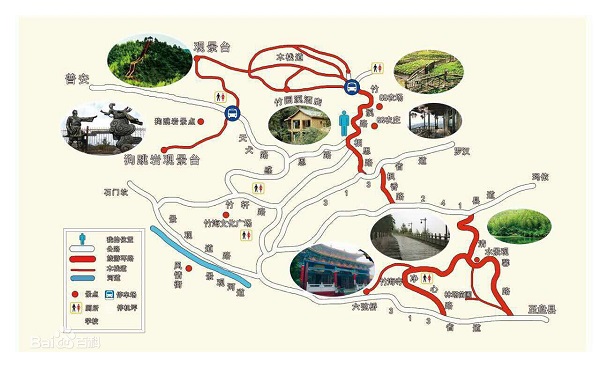 主要由竹园溪风情酒店、情人谷、狗跳崖、万亩竹海、万亩杉林、百里杜鹃、竹海寺等景点。