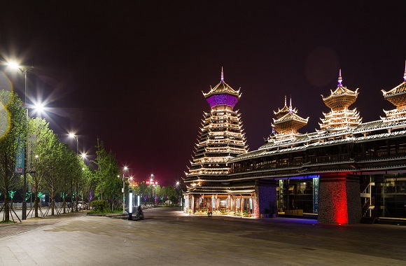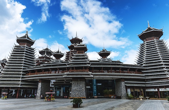 其主体建筑综合采用了侗家鼓楼、风雨桥、铜鼓和箫笛四大元素进行设计。环廊中间分别布置敞轩鼓楼、六边鼓楼、八边鼓楼、六变八边鼓楼及入口抽象鼓楼,大小24个鼓楼共同演绎五凤文化,共同构成全国最大的单体鼓楼群。