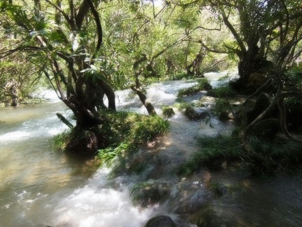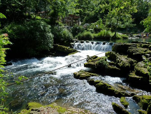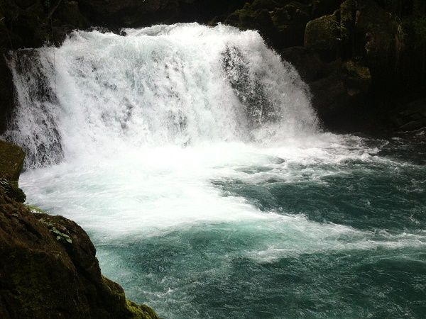 暗河从崖底涌出,潭面上不见踪影,只见卧龙坝雪崩似的滚水瀑布,潭外流淌不息的渠水,才感到卧龙河在潭底翻动。