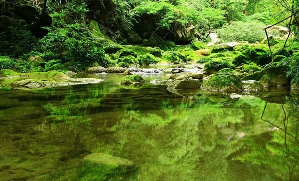 潭边怪石奇树林立,古木森森,潭外水声轰鸣,雾雨蒙蒙,四周高山紧锁,水潭犹如地底深渊,即便是发洪水时,潭面也犹如镜子般平静。
