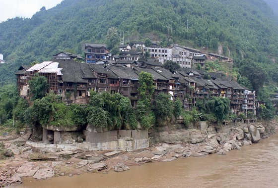 丙安古镇三面濒临赤水河,河边建有许多由数百根圆木支撑在赭色岩石上的吊脚楼,蔚为壮观。