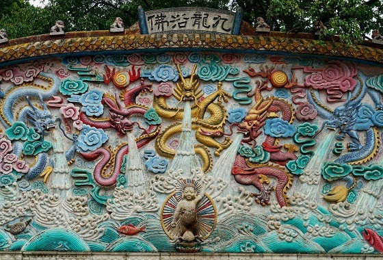顺着七星潭走几步,就是上山路了。如果不想爬山,可以坐索道直达象王岭上的瞰筑亭。爬山的话,沿着九曲径拾级而上,山上植被茂密,空气很新鲜,一路上还能看到摩崖石刻群。山不是特别高,距离地面的垂直距离大约是200米。山顶有一座始建于清代的弘福寺,据说寺里祈福很灵验,所以来拜的信徒很多。