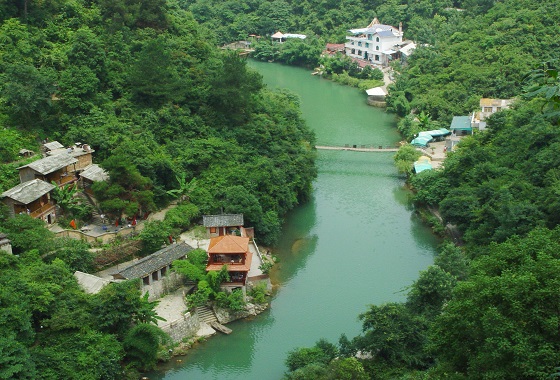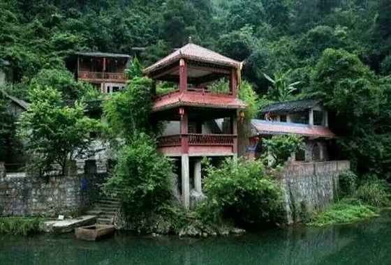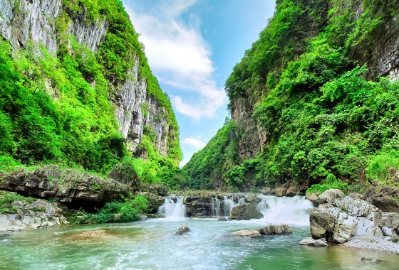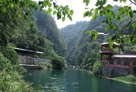 一座座风格各异的休闲山庄依山而建、傍水而立,和大自然的青山绿水相映成趣。沿河向上而行,河水渐渐由安静变得活泼,欢欢快快一路流来,似与水中石头逗乐嘻戏,激起朵朵浪花。峡谷也越来越深,越来越窄,向上仰望,天成一线。两岸山崖越来越陡,越来越高,与天上白云相接。让你充分领略宋朝词人秦观“山抹微云”的极妙意境。但树木藤萝依然茂盛,鸟语清鸣、花香脉脉、林荫清凉,令人心旷神怡。