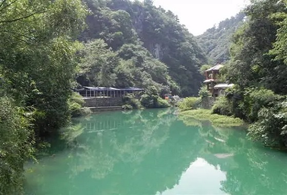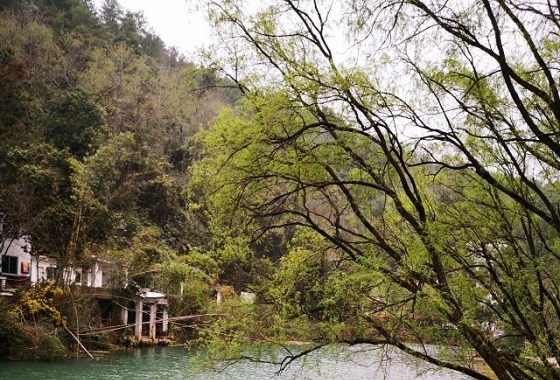 峡谷入口,河之下游,河面平静如镜,两岸依依垂柳、翠绿青山倒影水中清晰可见。如在河面荡一叶小舟,你会倍感“人在画中游”的悠然。