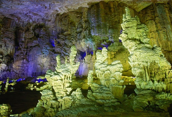 织金洞雪香宫全长300余米,面积6000余平方米,岩溶堆积物如雪原风光,钟旗如扣钟声,石竹如密筿丛生。