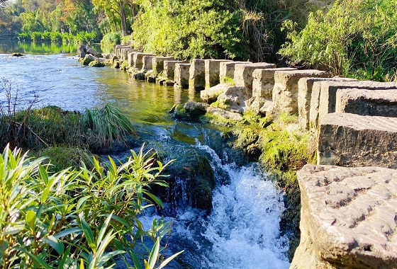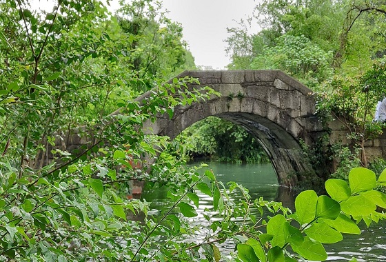 百步桥,又名跳墩,因由一百三十多个相隔约两尺的石墩立于河上,游人需跳踩石墩而过,故而得名。