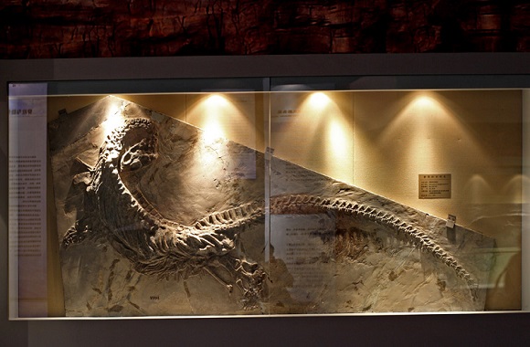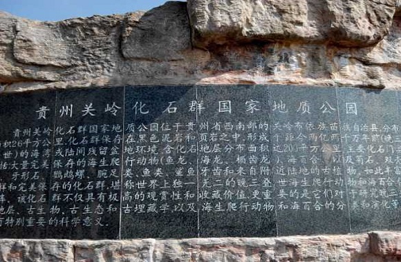 贵州关岭化石群国家地质公园埋藏的古生物化石形成于距今2亿2千万年前的海湾是中国珍奇三叠纪古生物化石宝库,主要包括鱼龙、海龙、鳍龙、木盾齿龙等海生爬行动物,也有千姿白态的海百合和菊石、双壳、牙形石、鹦鹉螺、腕足及陆地生长的异地保存的古植物化石。