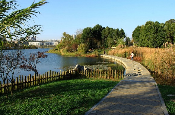 由观山湖和金华湖组成的生态湿地水体面积约600亩,吸引了数百只白鹭、野鸭等鸟禽在此栖息;