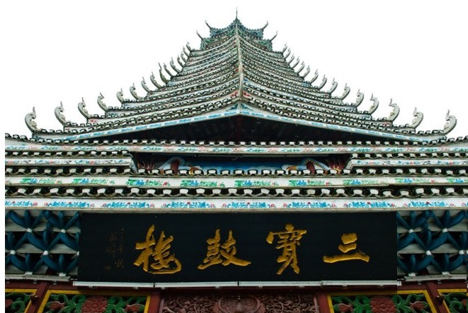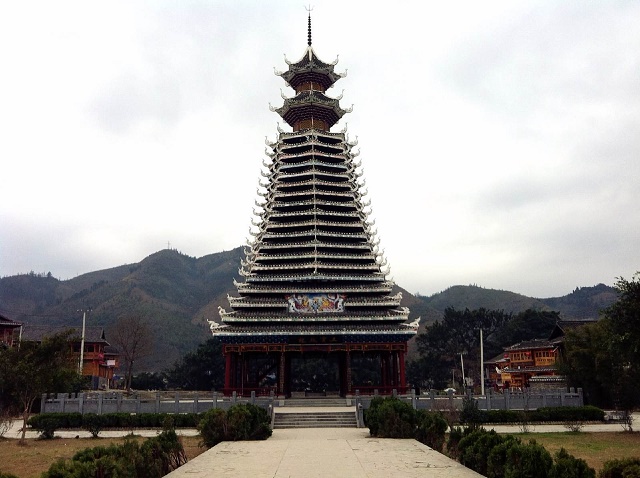 "三宝鼓楼"集中国侗族历史文化之大成,是古榕风景名胜区一道亮丽的风景。