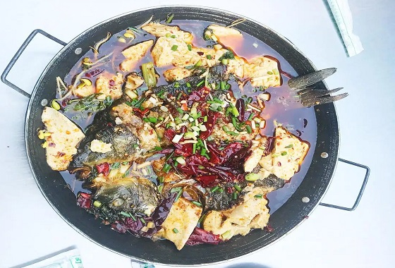 赤水豆花烤鱼以赤水河鲤鱼为原料。将鲜活鱼去鳞、剖开,去掉内脏,擦净,置于烤炉上,边烤边涂佐料,反复翻烤,涂佐料,直至熟透,最后以鱼香菜垫底,将烤好的鱼置于盘中,配以豆花,再淋上配料。