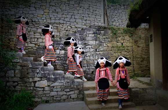 长角苗自称“蒙茸”(苗文写作hmongb rongt),多数学者认为其属于箐苗支。长角苗大约有4千多人,住在梭戛高山上的12个寨子里,在上世纪90年代中期前一直过着与世隔绝的日子,苗寨依山而建,土墙茅房,原始质朴、纺纱织布,画蜡刺绣,飞针走线缝制美丽的衣裙,日出而作,日落而息,民风民俗保持完整,民族文化深厚,堪称人类活化石。长角苗身着传统的民族服饰,上身是白底蓝花的蜡染短衣,下穿黑底、红白横边的百褶裙,身后还拖着条画绣片,身前挂一个羊毛毡护兜。