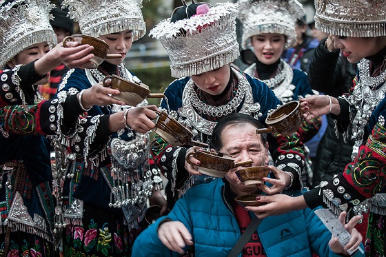接亲队伍到来后,女家设宴招待。女方本家亲戚和外家亲戚一同作陪。新娘和寨上的姑娘(多为同宗姐妹)又持壶上前敬酒,男方的来客仍要在饮酒后赠送红包,作长辈的,红包内的现金相对要多些。